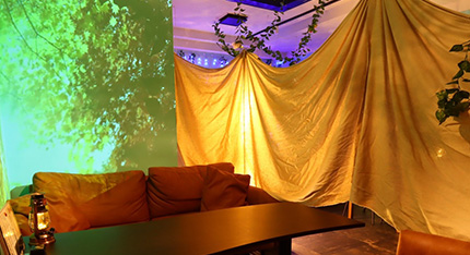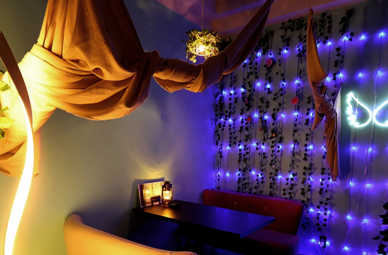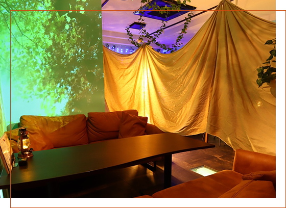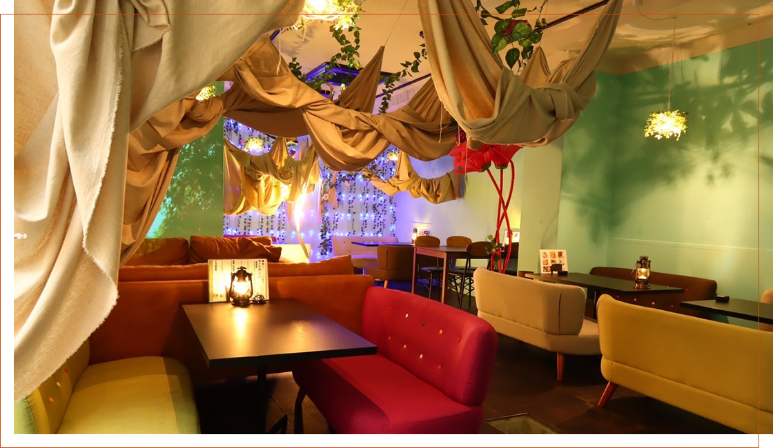 店内は写真映え間違いなしな、グランピング気分を味わえる非日常空間。ゆったりとしたソファー席になっており、各テーブルをカーテンで仕切って個室にできるので、デートや女子会など、プライベートなお集まりにも最適です。